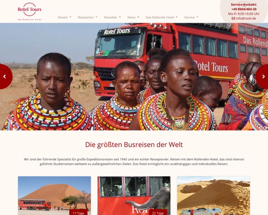Seit seiner Gründung im Jahr 1945 hat sich Rotel Tours als ein Pionier in der Welt der Reisen etabliert. Bekannt für seine einzigartigen "Rollenden Hotels", bietet das Unternehmen außergewöhnliche Reiseerfahrungen an, die sowohl abenteuerlustige als auch kulturell interessierte Reisende ansprechen. Rotel Tours ermöglicht es seinen Gästen, die Welt auf eine Weise zu entdecken, die Komfort und Unabhängigkeit vereint.